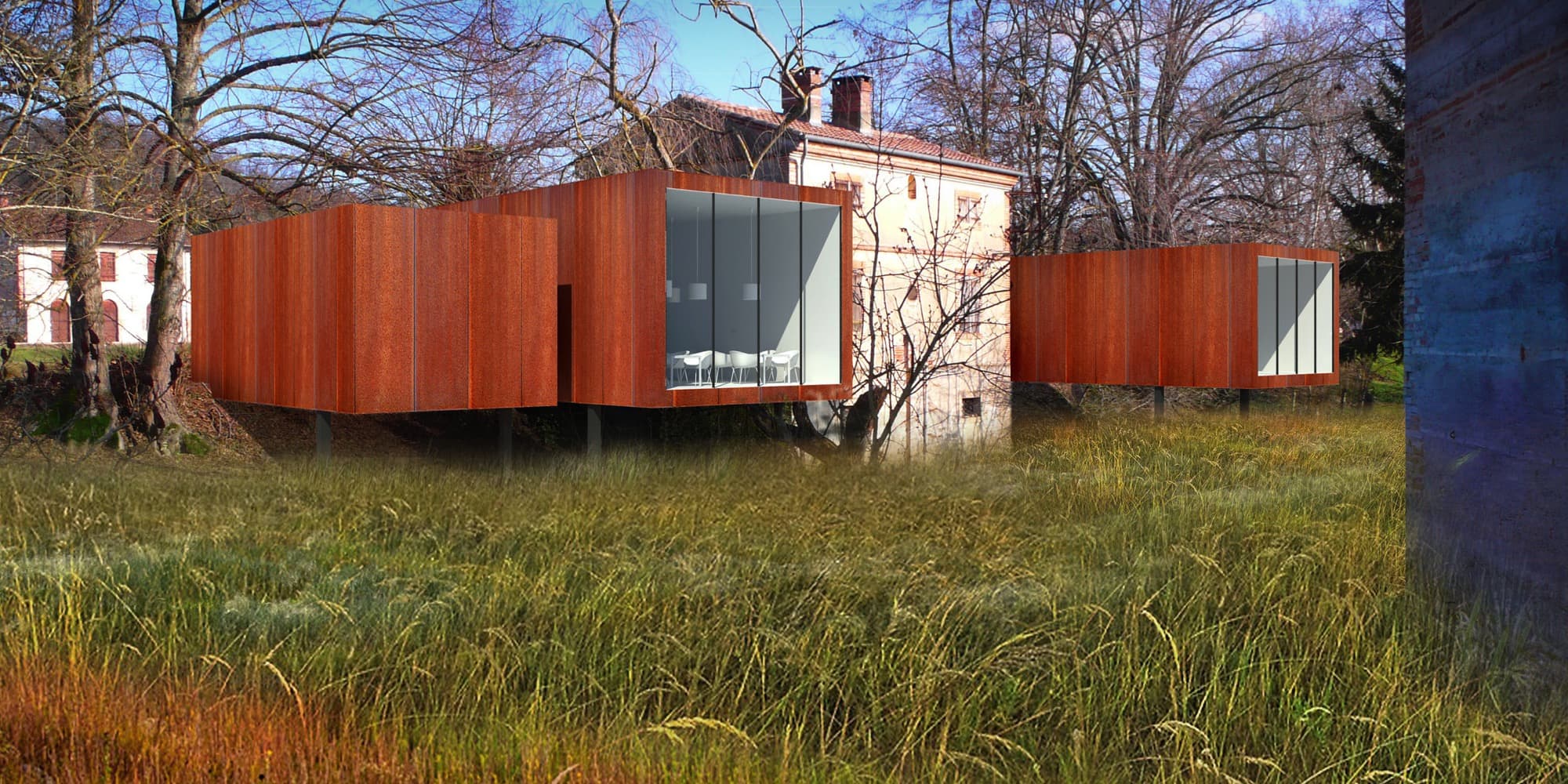 The study for the Grisolles commune also involves creating of a stopover with a reception building and mooring pontoon. This creates an opportunity to redesign the river banks, to encourage re appropriation by boat users as well as by town dwellers. At Dieupentale, a lockmasters house becomes a hiking/bike stopover with a restaurant-bar. Between the two a red line serves both as signage and facilitates a reconnaissance of the bike and pedestrian pathway on the inter communal territorial continuity.