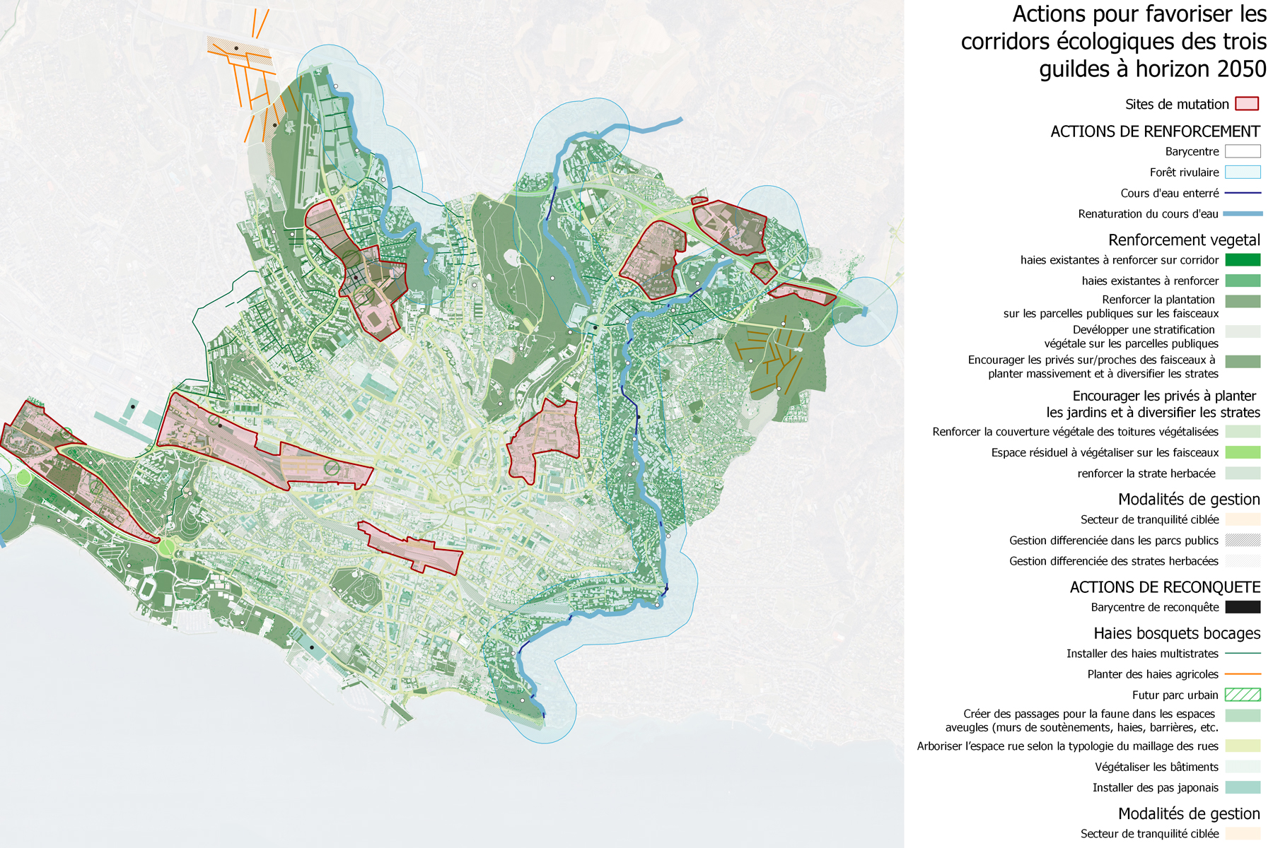 Une cartographie d’actions a ensuite été établis. Deux grandes catégories ont émergé : des « actions de renforcement » fondées sur la revalorisation de l’existant, et des « actions de reconquêtes » qui mettent en place des nouveaux aménagements, dispositifs.