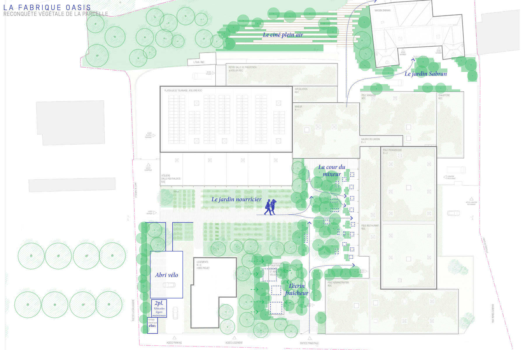 Un lieu de vie acclimaté et fertile est proposé aux utilisateurs humains et non humains du site. Les espaces extérieurs sont fortement imbriqués avec les espaces de vie intérieurs du bâtiment (mixeur, restaurant). Le patrimoine végétal existant, mature, en pleine terre et de grande qualité est le levier de la création du jardin de CinéFabrique.
