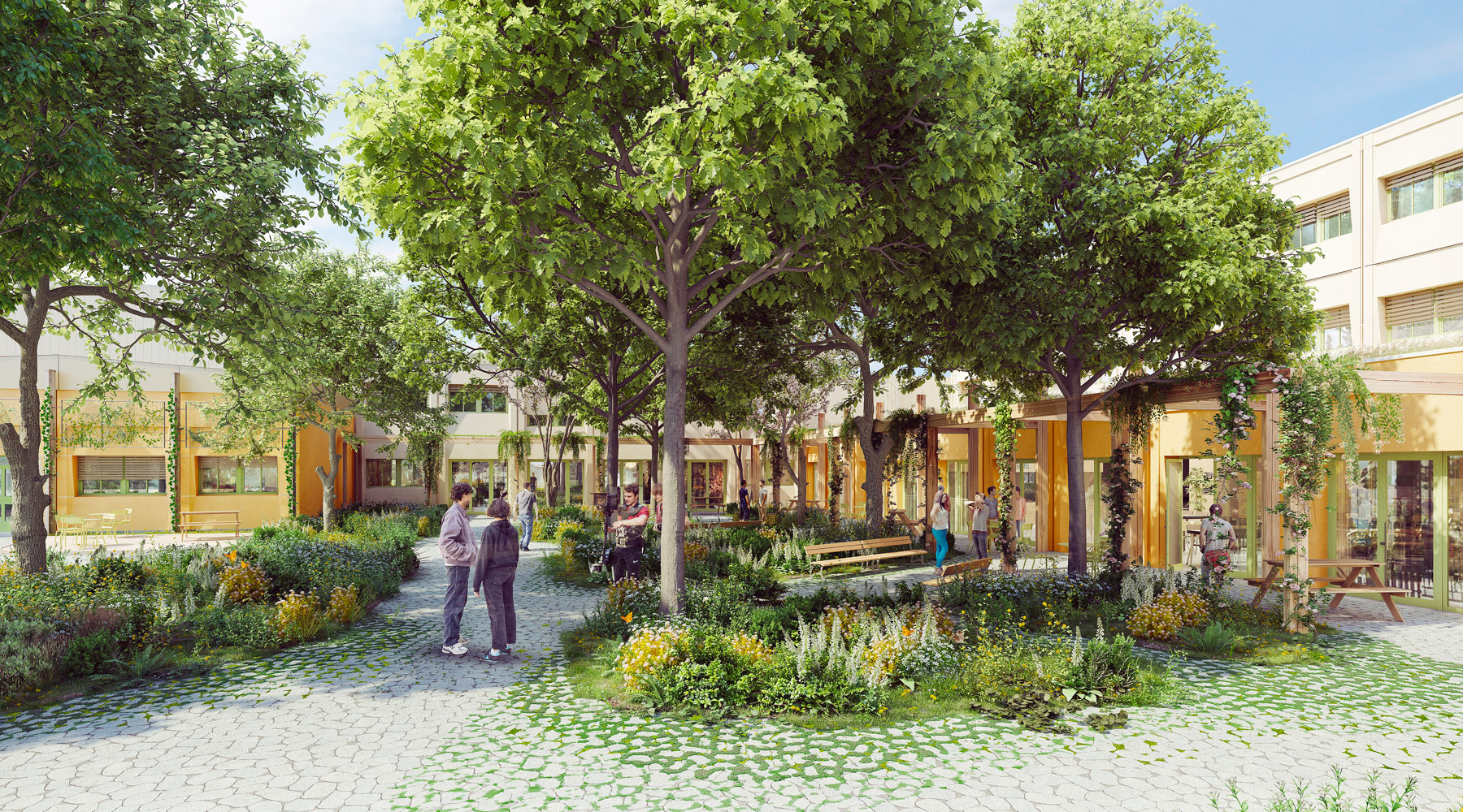 L’entrée de l’école s’ouvre sur un axe de cheminement piéton longeant le potager et le stationnement vélo et guidant les visiteurs vers la cour du Mixeur, cœur de la vie sociale de l’école.