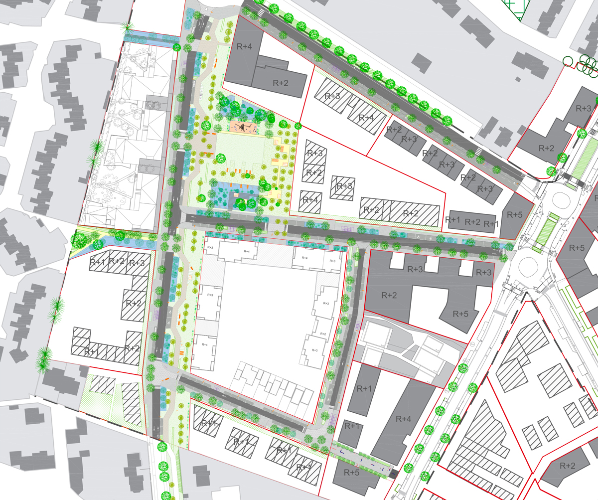 Notre équipe (BASE mandataire) a pour mission la fabrication d’un plan guide et la coordination urbaine, depuis la réalisation des faisabilités jusque la mise au point des PC en passant par le choix des équipes de maîtrises d’oeuvre, de 1600 logements sur quatre des secteurs : Verger du Launay, Bêle Champ de Tir Nord, Bourg Nord et Conardière. Il s’agit d’une part de mettre en place une approche commune, faite d’attention et de respect de l’existant, de mise en valeur de la géographie et de modération au regard des tissus en présence. D’autre part, il s’agit de travailler par distinction l’ancrage de chaque secteur. Il est question de générer des modes de vie en dialogue avec l’extérieur et des espaces collectifs partagés. Dans ce sens, le développement de typologies d’habiter innovantes est incité au sein de la ZAC.